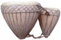 It consists of two small cone-shaped clay pots of different widths and the same height. They are covered with calf leather or bull's bladder. The pots are tied together with a cord. Their height is 200–250 mm, the diameter of the smaller one is 90 mm and the larger one — 170 mm. The diameter of the narrowed base is 25–50 mm. It is painted in various colors on the outside.
