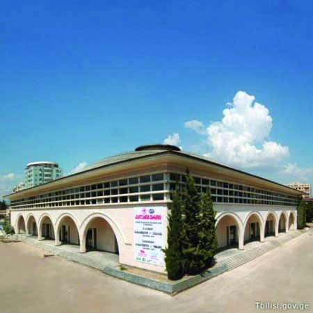 Tbilisi Sports Palace, sports arena in Tbilisi (architects V. Aleksi-Meskhishvili, Y. Kasradze, constructor D. Kajaia). The project was approved in 1956, built in 1957–1961. It was opened on May 12, 1961. The outer perimeter of the square-shaped building is 352 m (88×04). The main arena – 44x27.4, the elevated stands can accommodate 9,305 spectators. The first floor of the building is sunk into the ground. The Sports Palace is covered with a spherical dome of reinforced concrete columns, the diameter of which equals to 76 m. Along with the main arena, the Tbilisi Sports Palace includes two arenas with the appropriate infrastructure. The Tbilisi Sports Palace regularly hosts international competitions in various sports. Mass performances (ballroom dances, pop concerts) are held there; Sport sections are in operation; Children's skating school also operates there. In 1989, the “Museum of Georgian Sports Glory” was opened in the Tbilisi Sports Palace. The palace was named after G. Kartozia in 2001.In 1965, a sculptural composition was erected on the square in front of the Tbilisi Sports Palace — Mzechabuki (sculptor J. Mikatadze), and in 2010 — a statue of Givi Kartozia (sculptor G. Shkhvatsabaia).