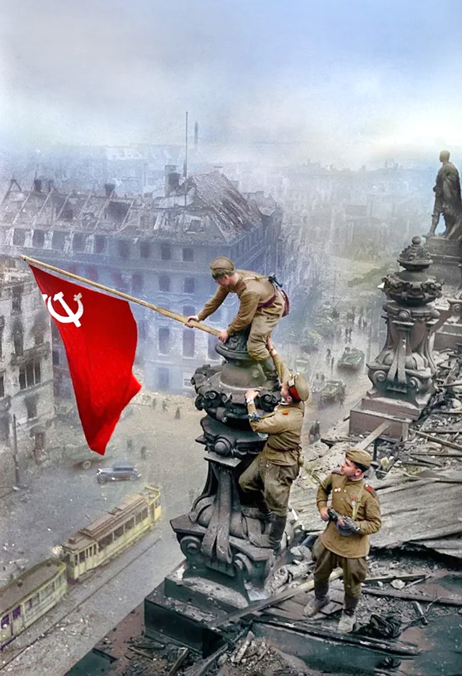 1944 წ. 6 ივნისს ნორმანდიაში დესანტის გადასხმით გაიხსნა მეორე ფრონტი. ევროპის ტერიტ-ზე ამერიკელებისა და ინგლისელების ჩართვამ ომში არაერთი საბჭ. მეომრის სიცოცხლე გადაარჩინა და დააჩქარა ფაშიზმის საბოლოო მარცხი. აღმ. ევროპის ქვეყნების გათავისუფლებისთვის ბრძოლებში მონაწილეობდნენ 242-ე და 351-ე ქართ. ეროვნ. დივიზიები. ათასობით ქართვ. მებრძოლი მონაწილეობდა ბერლინის შტურმში. სწორედ ქართველმა მ. ქანთარიამ, რუს მ. ეგოროვთან ერთად აღმართა წითელი დროშა რაიხსტაგზე 1945 წ. 1 მაისს. ორივე მებრძოლს სსრკ გმირის წოდება მიენიჭა. სსრკ- გერმანიის ომი 1945 წ. 8 მაისს ფაშისტური გერმანიის სრული კაპიტულაციით დამთავრდა. სსრკ-ში ეს სასიხარულო ცნობა მეორე დღეს, 9 მაისს გამოცხადდა. მ. მ. ო. კი კვლავ გრძელდებოდა. წინააღმდეგობას განაგრძობდნენ იაპონელები. სამოკავშირეო ვალდებულებების თანახმად, იაპონიის წინააღმდეგ ომში 1945 წ. 2 აგვისტოს ჩაერთვნენ საბჭ. შეიარაღებული ძალები, რ-თა რიგებში დაახლ. 7–8 ათასი ქართვ. იბრძოდა. საბჭ. ჯარებმა 23 დღის განმავლობაში შეძლეს იაპონელთა მილიონიანი კვანტუნის არმიის განადგურება და ჩინეთის ჩრდ.-აღმ. პროვინციების, აგრეთვე, ჩრდ. კორეის, სამხრ. სახალინისა და კურილიის კუნძულების დაკავება. ამერიკელებმა, 1945 წ. 6 და 9 აგვისტოს ორი ახლად შექმნილი ატომური ბომბი ჩამოაგდეს ჰიროსიმასა და ნაგასაკიში, რასაც ასი ათასობით მშვიდობიანი მცხოვრები ემსხვერპლა. 1945 წ. 2 სექტემბერს იაპონიამ სრული კაპიტულაცია გამოაცხადა. მ. მ. ო. დამთავრდა.